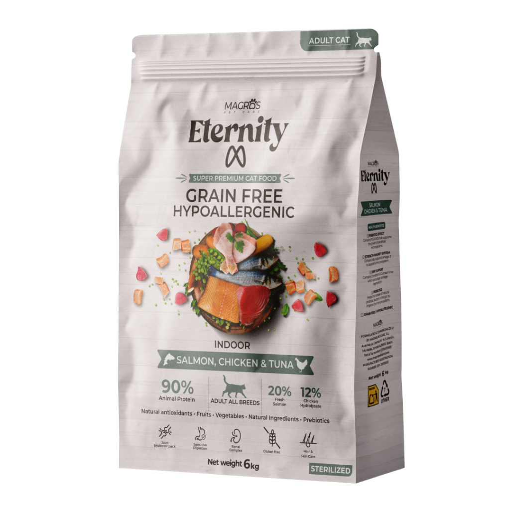 Hypoallergenic, grain-free complete food with fresh salmon developed for adult cats living indoors and neutered cats.