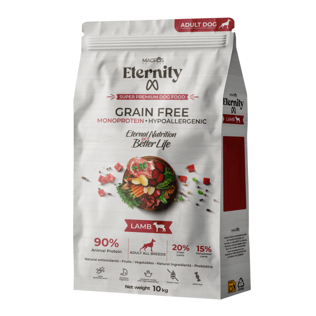 Complete hypoallergenic, monoprotein, grain-free food with fresh lamb, developed by our nutrition experts for adult dogs of all breeds